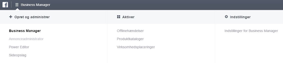 Når du vil samle dine forskellige afdelinger skal du åbne Business Manager. Her klikker du i øverste venstre hjørne på ”Business Manager”, hvorefter du vælger ”Virksomhedsplaceringer” under kolonnen ”Aktiver”. Hvis du ikke kan se denne mulighed, betyder det, at du ikke er administrator eller redaktør på siden, hvilket er påkrævet.