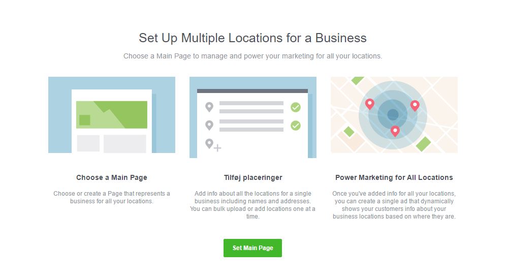 Fordelen ved at samle en virksomheds afdelinger under en hovedside er, at du får mulighed for let at offentliggøre opslag på alle afdelingernes Facebookside ved blot at dele det på hovedsiden. Det er dog stadig muligt at offentliggøre opslag på den enkelte afdelingsside også. Det bliver desuden også lettere at administrere de lokale annoncer, og så hjælper du kunderne med at finde den rigtige butik. Så skal kunden ikke kontakte dig gennem hovedsiden, hvis der er tale om et lokalt spørgsmål.